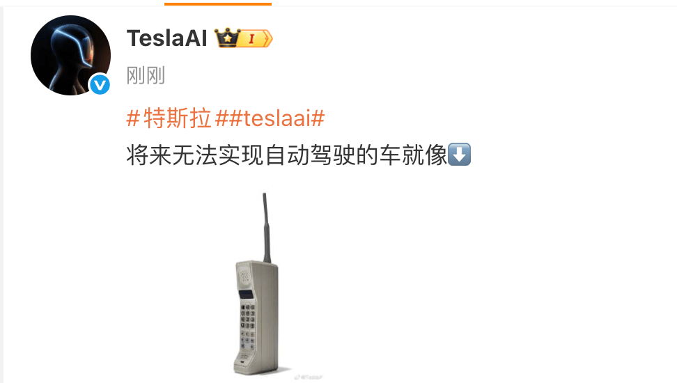 凤凰网科技讯 12月25日 ,特斯拉官方账号发文,称将来无法实现自动驾驶的车就像“大哥大”。