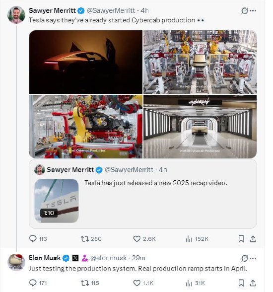 马斯克称正测试Cybercab生产系统,量产将从4月开始